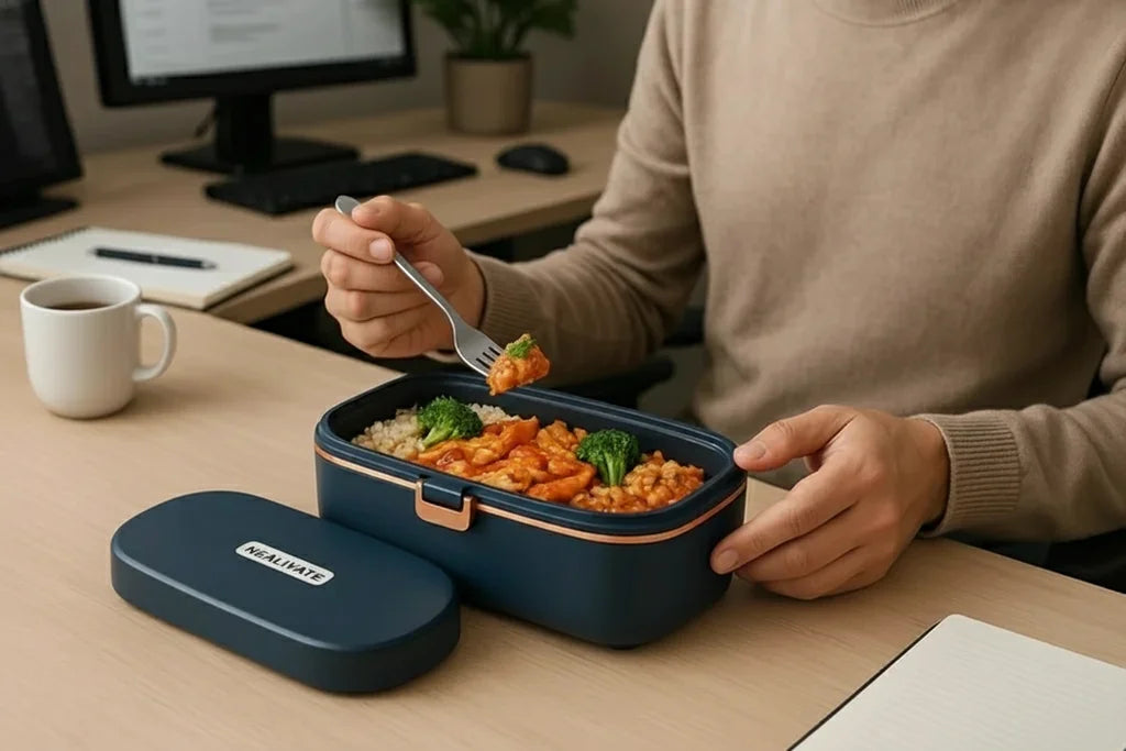 Enjoy nutritious, homemade meals at work, maintaining your healthy diet.
